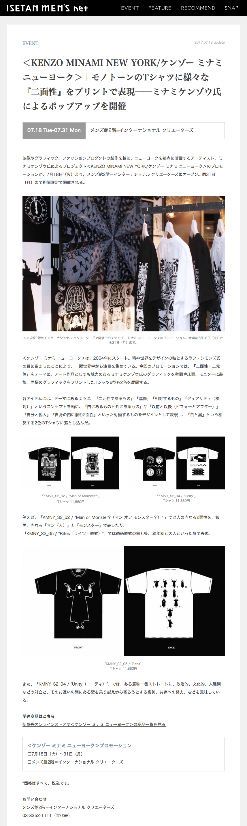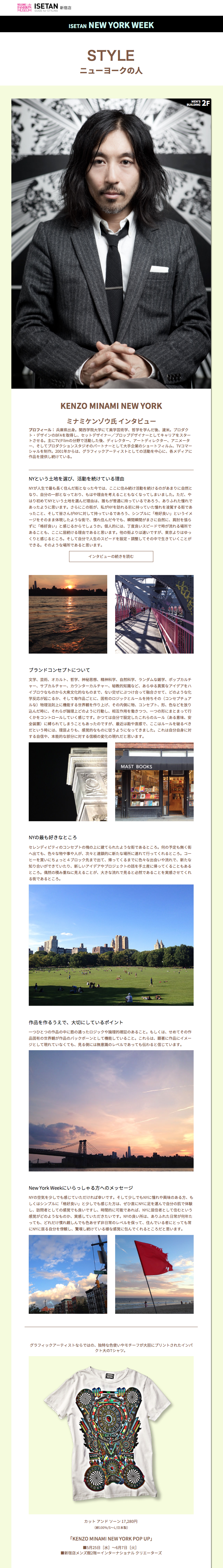 私のガーメント・Tシャツプロジェクトを『KENZO MINAMI NEW YORK』の名でソフトリブート致します。再始動にあたり、この1シーズン目は、三越伊勢丹限定でのリリースとなり、伊勢丹『ニューヨークウィーク』にて初リリース致します。この伊勢丹『ニューヨークウィーク』は、ニューヨーク市観光局後援によるもので、坂本龍一、ライアンマッギンレー、森山大道、ウイリアム クライン、ティファニー、チボマット 、佐久間裕美子、バテンウエア、ブルックスブラザーズ、ケイトスペード、ラグアンドボーン、マグノリアベーカリー、ポールスチュアート、等等、素晴らしい方々が関わっておられます。